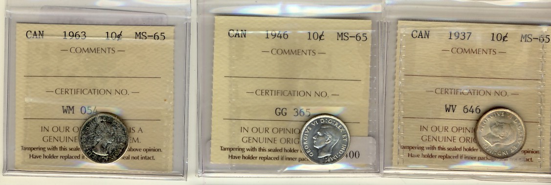 1937 10¢, 1946 & 1963 ICCS MS65. Lot of 3 coins.