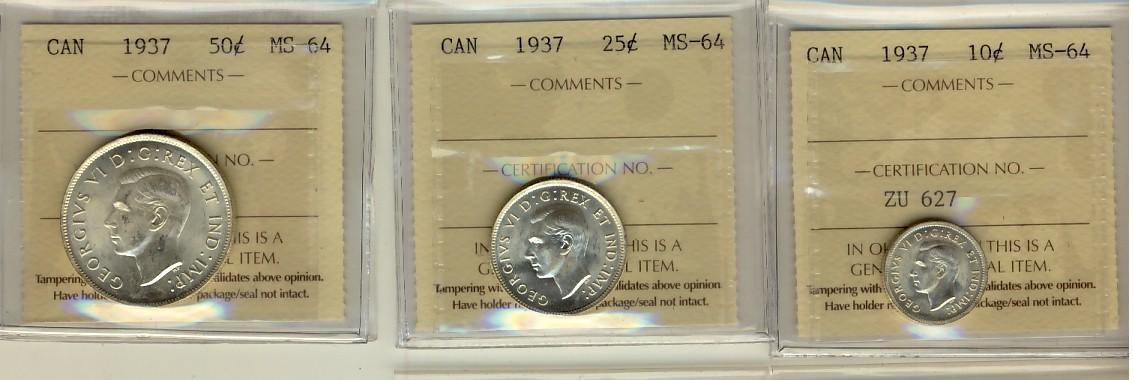 1937 10¢, 25¢, 50¢ ICCS MS64. Lot of 3 coins all brilliant.