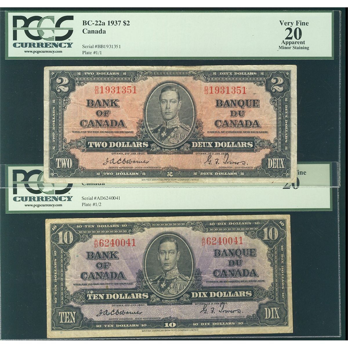1937 $10 BC-24a & $2 BC-22a PCGS VF20. Lot of 2 notes with the $2 showing minor staining.