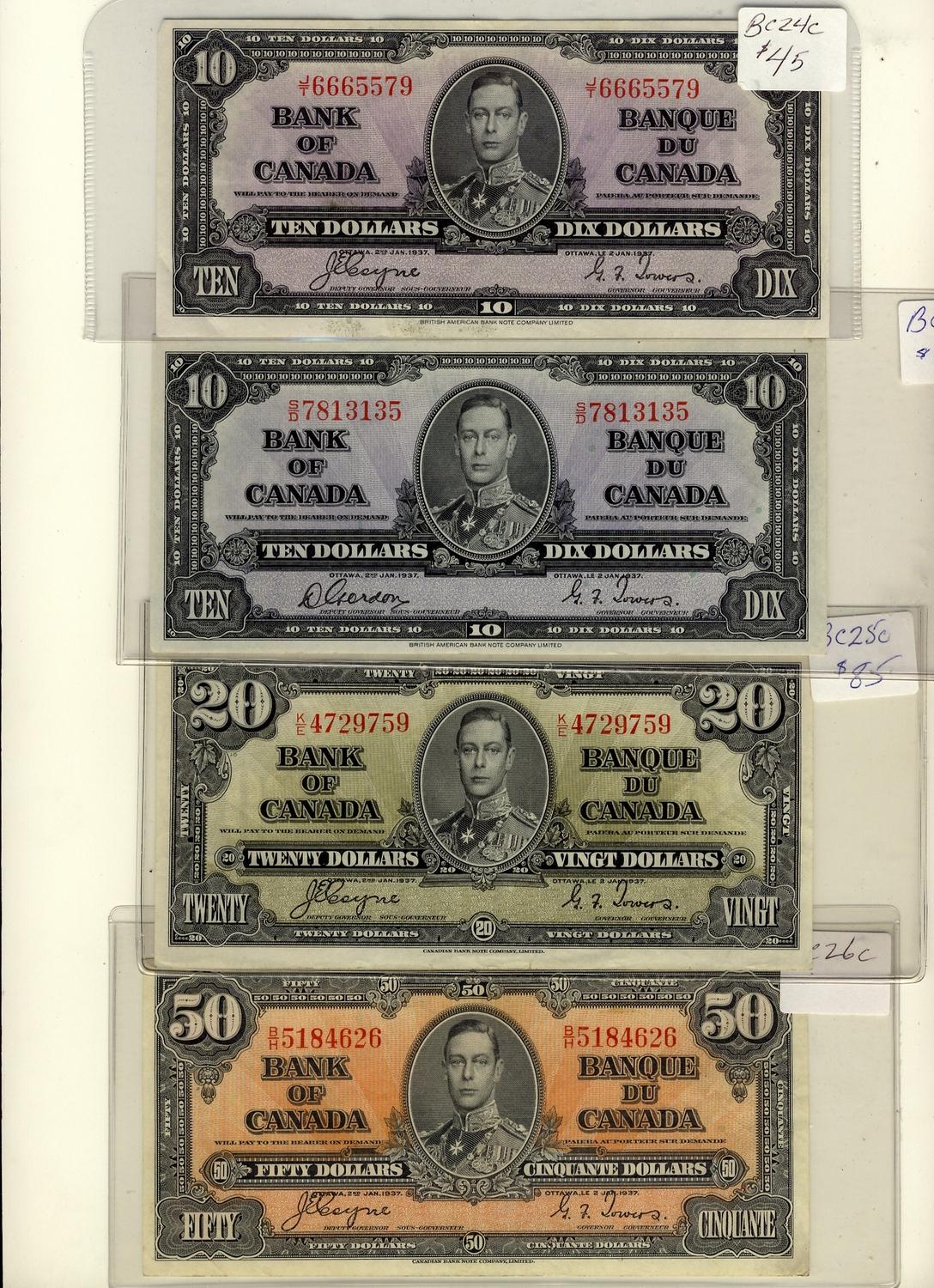 1937 $10 BC-24b, BC-24c, $20 BC-25c & $50 BC-26c. Lot of 4 notes VF to EF.