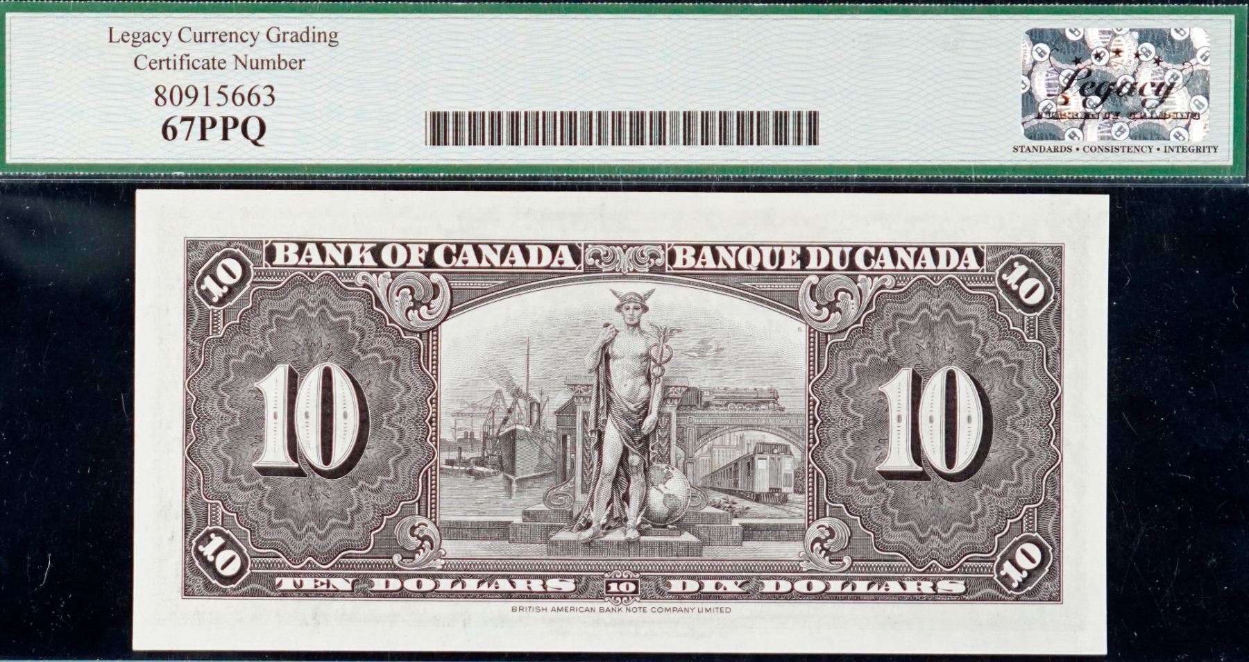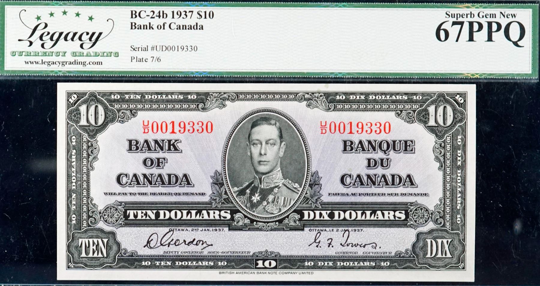 1937 $10 BC-24b #UD0019330, Legacy Currency Grading Superb Gem Uncirculated -67PPQ. This is a pristine issue with great eye appeal, good margins and superb embossing.