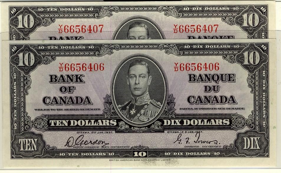 1937 $10 BC-24b #YD6656406 & 07. Lot of 2 consecutive notes. AU50.