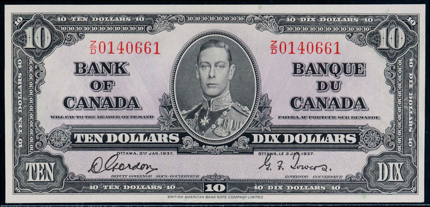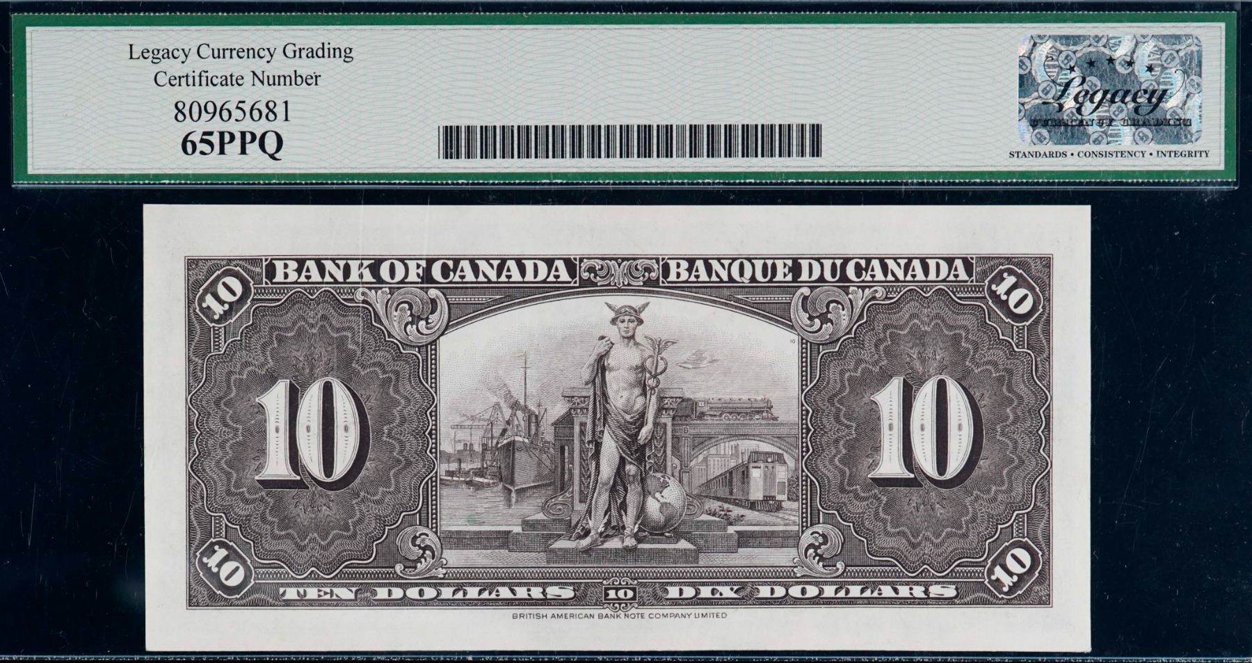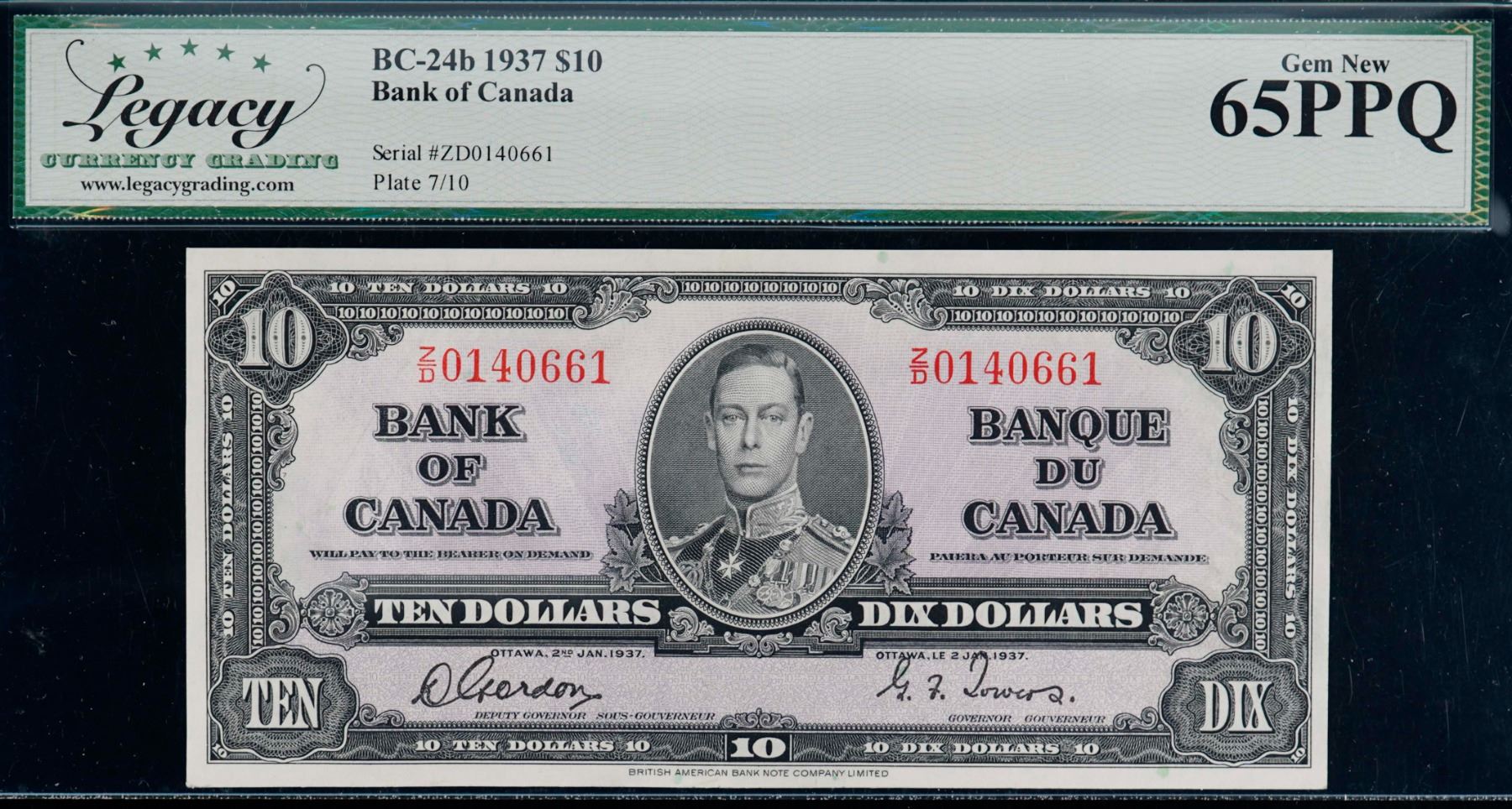 1937 $10 BC-24b #Z/D0140661 Legacy Gem Uncirculated-65PPQ. Scarce "Changeover Prefix". This is a pristine issue with great eye appeal, good margins and superb embossing. Amongst the finest examples seen and handled by TCNC.
