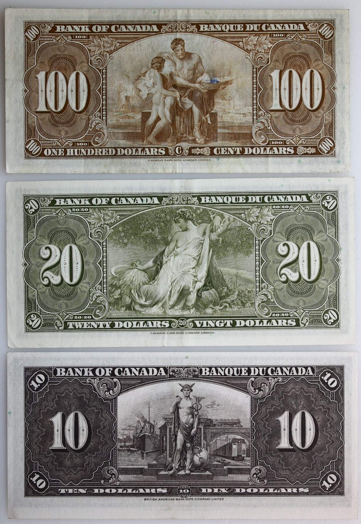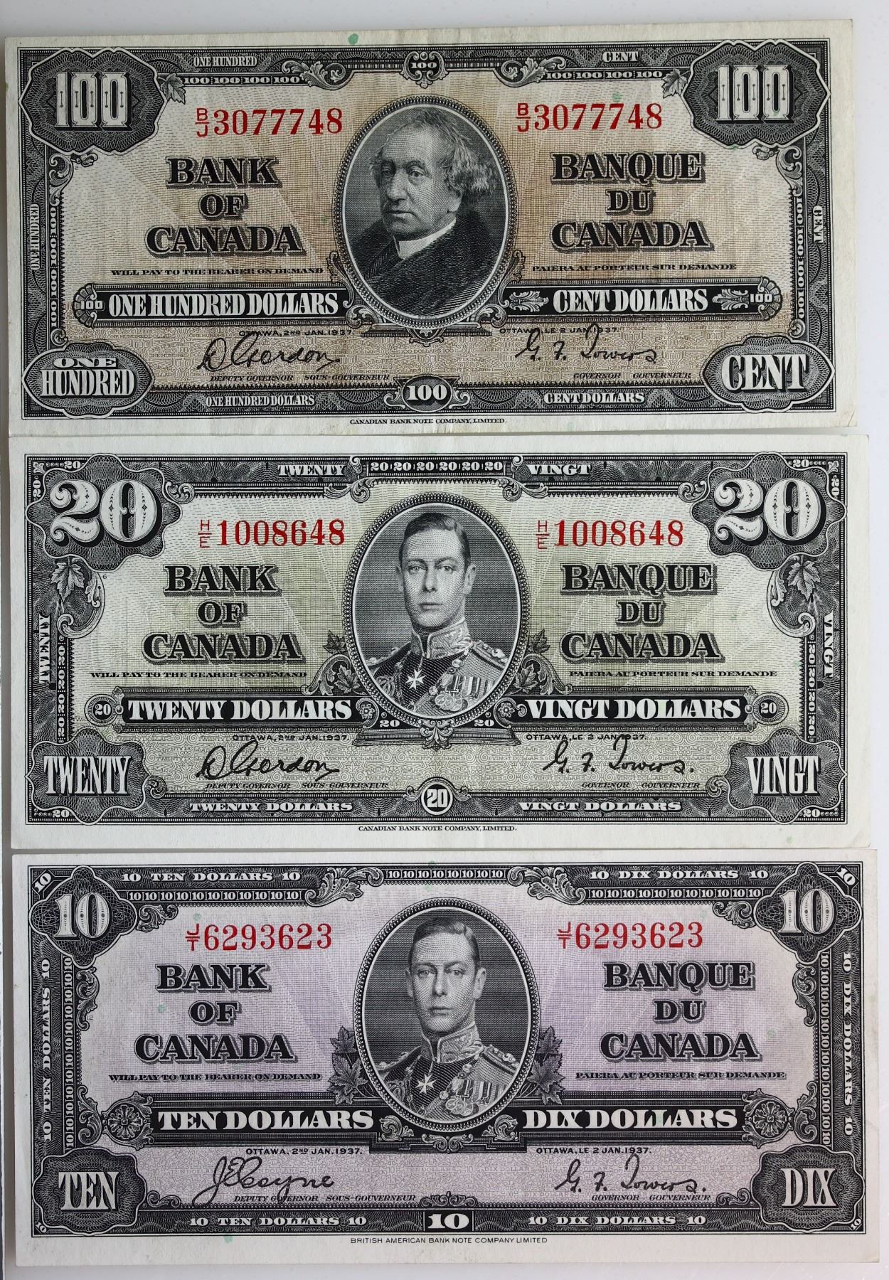 1937 $10 BC-24c, $20 BC-25b #HE1008648 & $100 BC-27b. Lot of 3 notes EF to AU.
