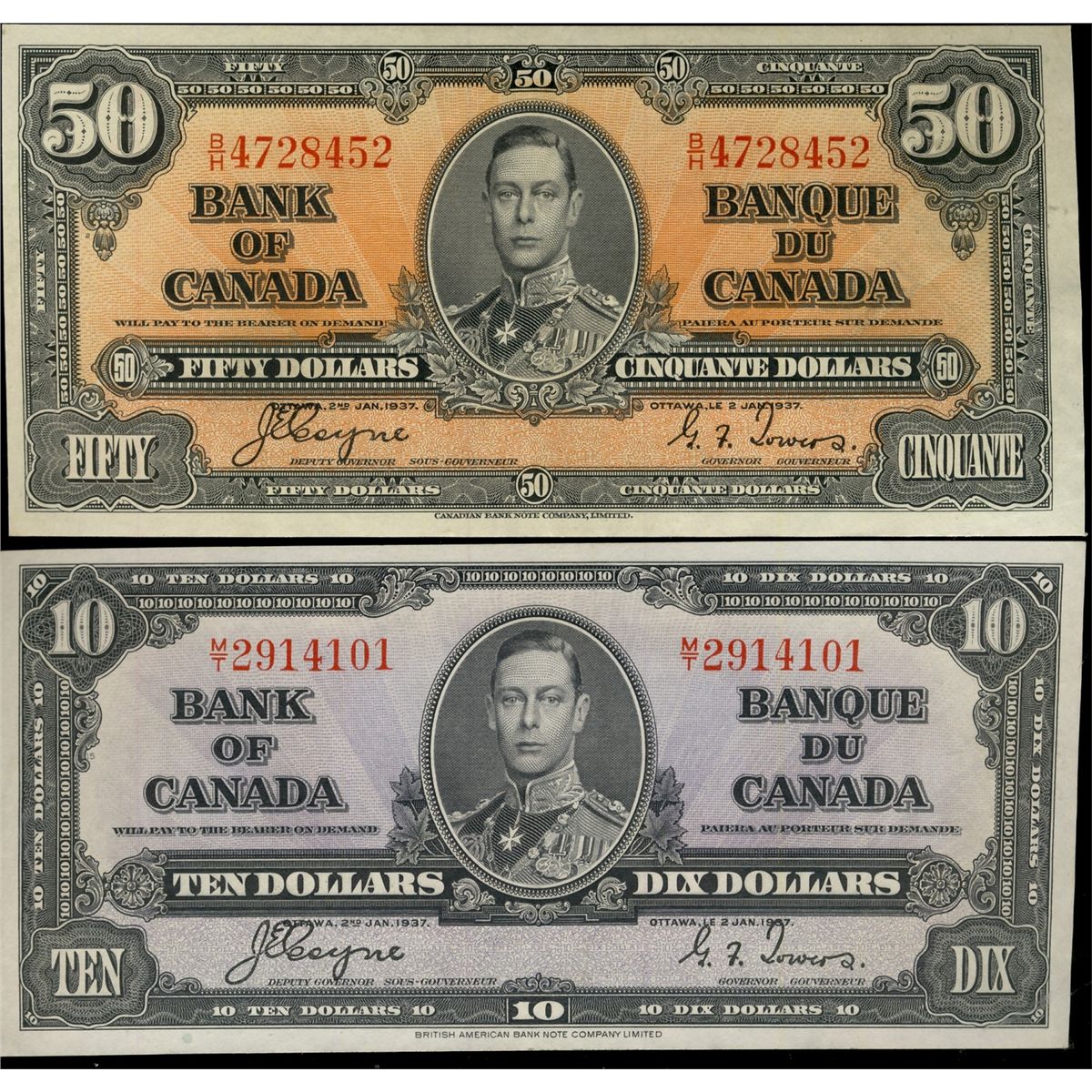 1937 $10 BC-24c #MT2914101 & $50 BC-29c #BH4728452. Lot of 2 notes EF to AU+.