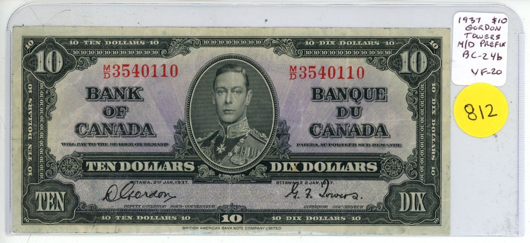 1937 $10. Gordon-Towers signatures. M/D Prefix. BC-24b. VF-20.