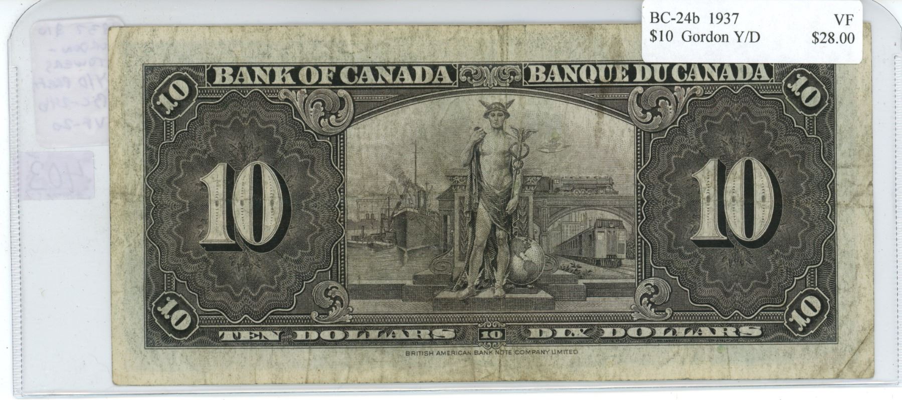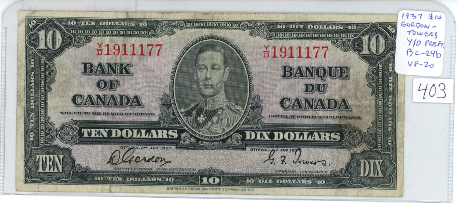 1937 $10. Gordon-Towers signatures. Y/D Prefix. BC-24b. VF-20.