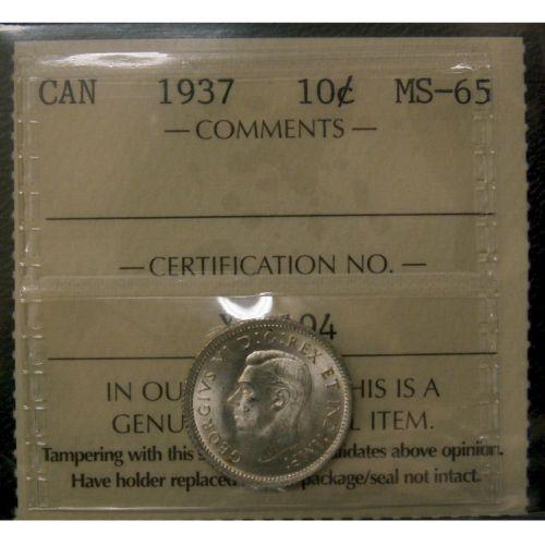1937 10¢ ICCS MS65. Brilliant with full luster. Excellent strike with clean fields and lovely surfaces.