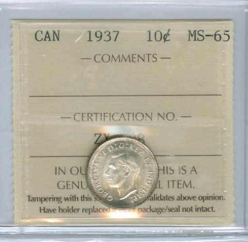 1937 10¢ ICCS MS65. Brilliant with full luster. Excellent strike with clean fields and lovely surfaces.