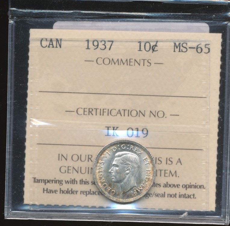 1937 10¢ ICCS MS65. Light russet tone with great lustre.