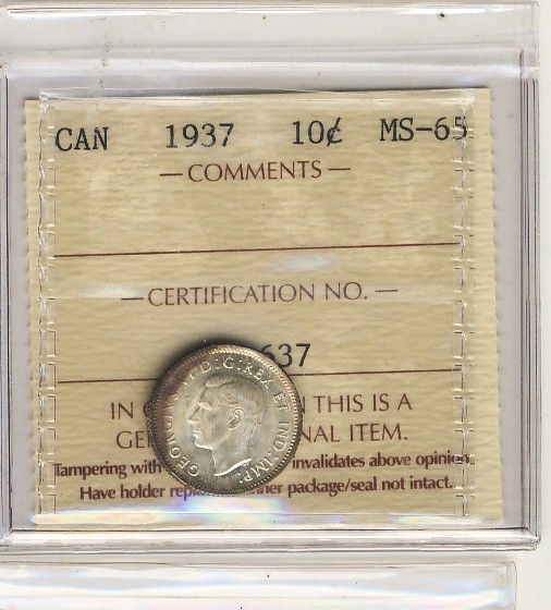 1937 10¢ ICCS MS65. Lovely Gem.