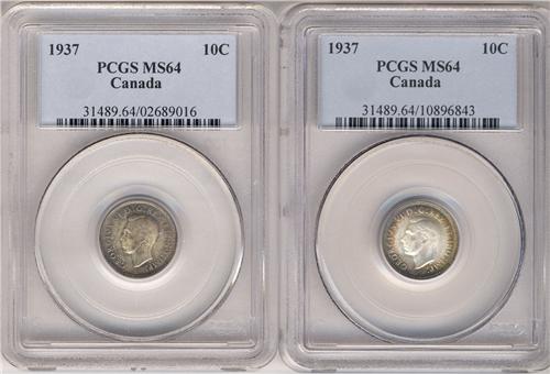 1937 10¢. Lot of two PCGS MS64 examples both showing great toning and lustre