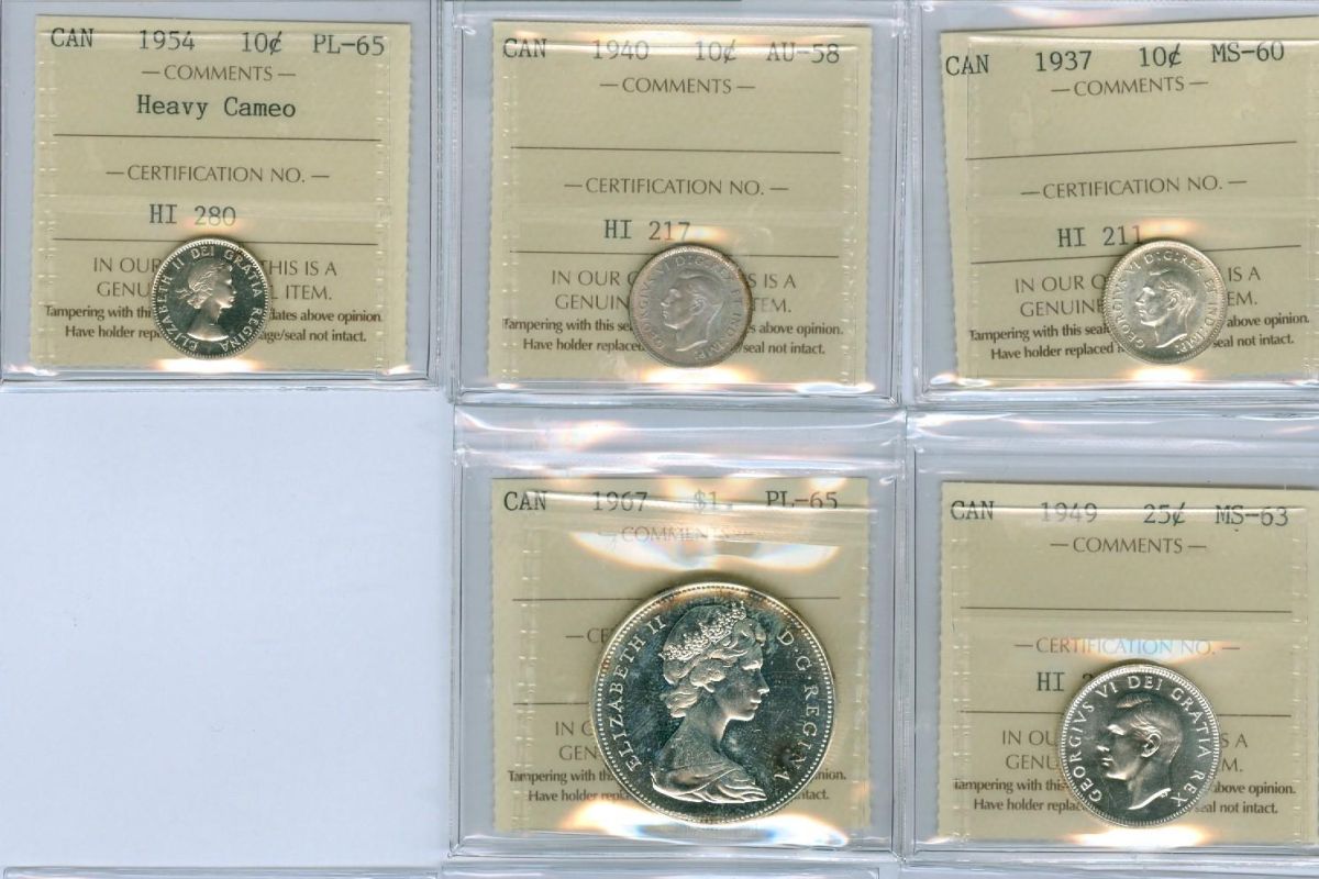1937 10¢ MS60, 1940 10¢ AU58, 1954 10¢ PL65 HC, 1949 25¢ MS63 and 1967 $1 PL65. Lot of 5 coins all ICCS graded.