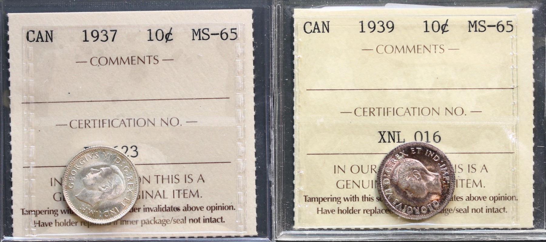 1937 10¢, and 1939 both ICCS Gem Mint State-65.