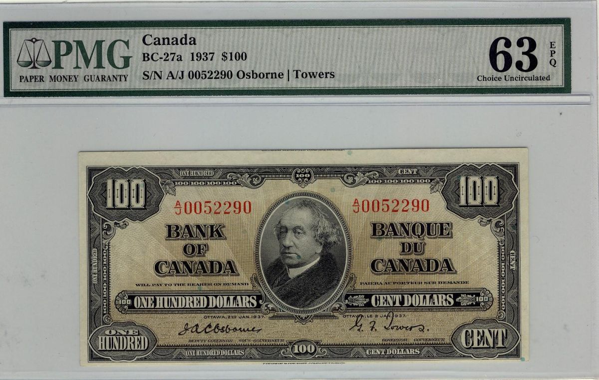 1937 $100 BC-27a A/J0052290 PMG UNC63EPQ. Vibrant colours with great embossing.
