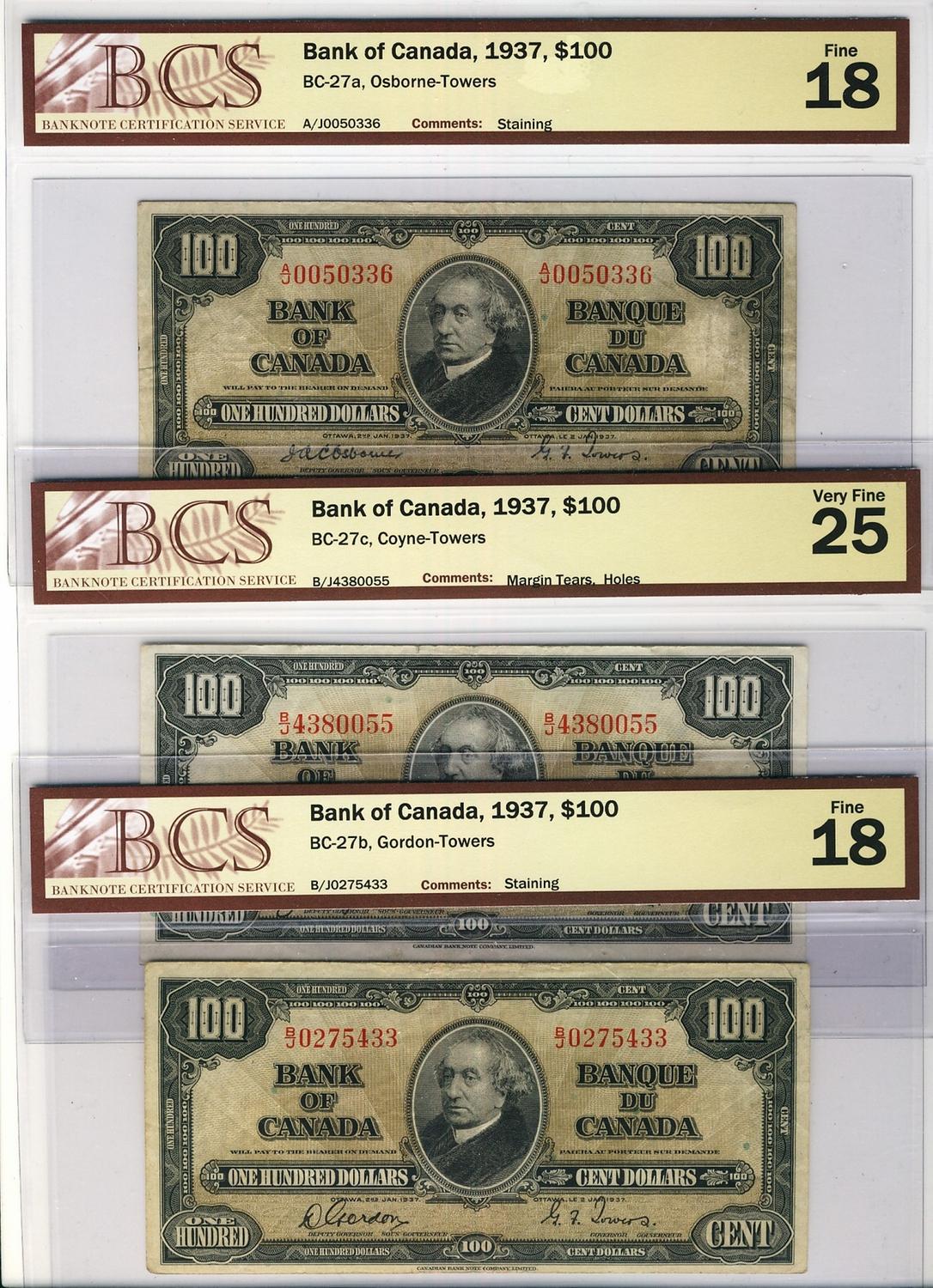 1937 $100 BC-27a F18, BC-27b F18 & BC-27c VF25. Lot of 3 BCS graded notes.