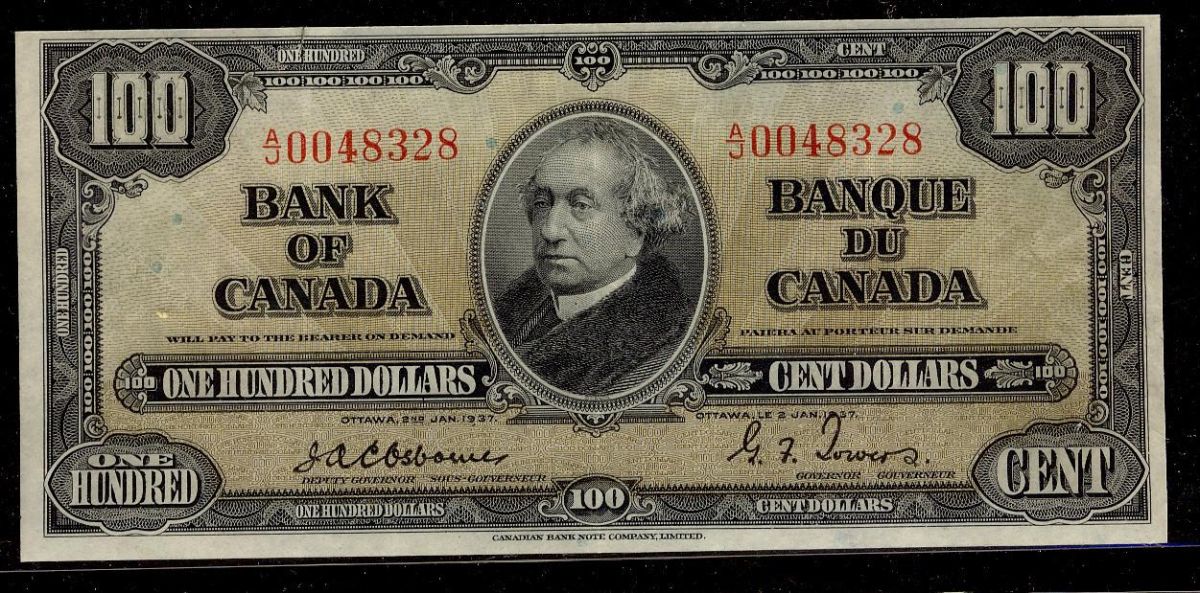 1937 $100 BC-27a Osborne #A/J0048328. A nice VF-EF issue with minor repaired tear.