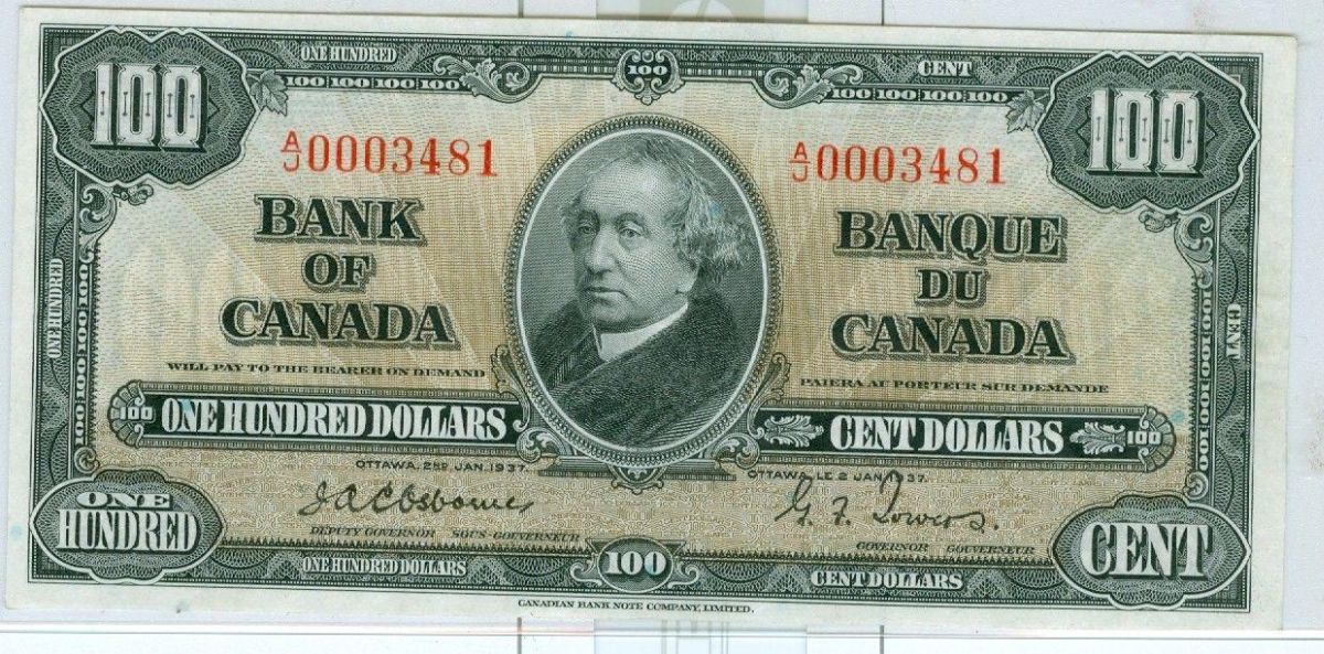 1937 $100 BC-27a Osborne #AJ0003481 CCCS UNC-63. Bright example with nice colours. A lovely and rare example.