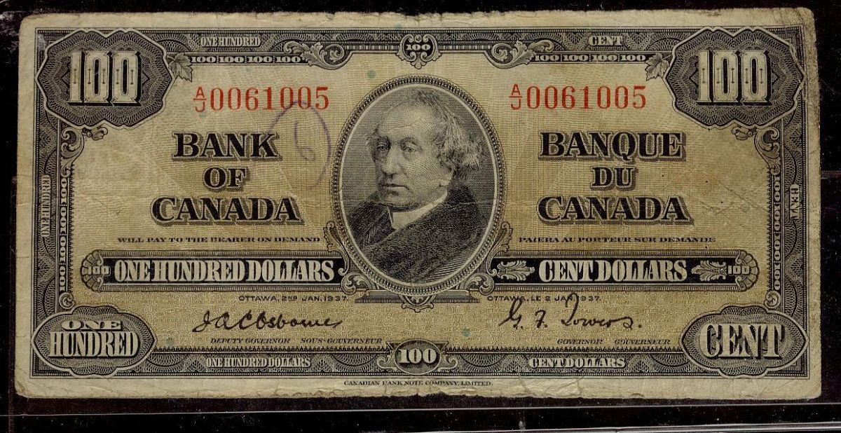 1937 $100 BC-27a Osborne #AJ0061005, VG with light writing.