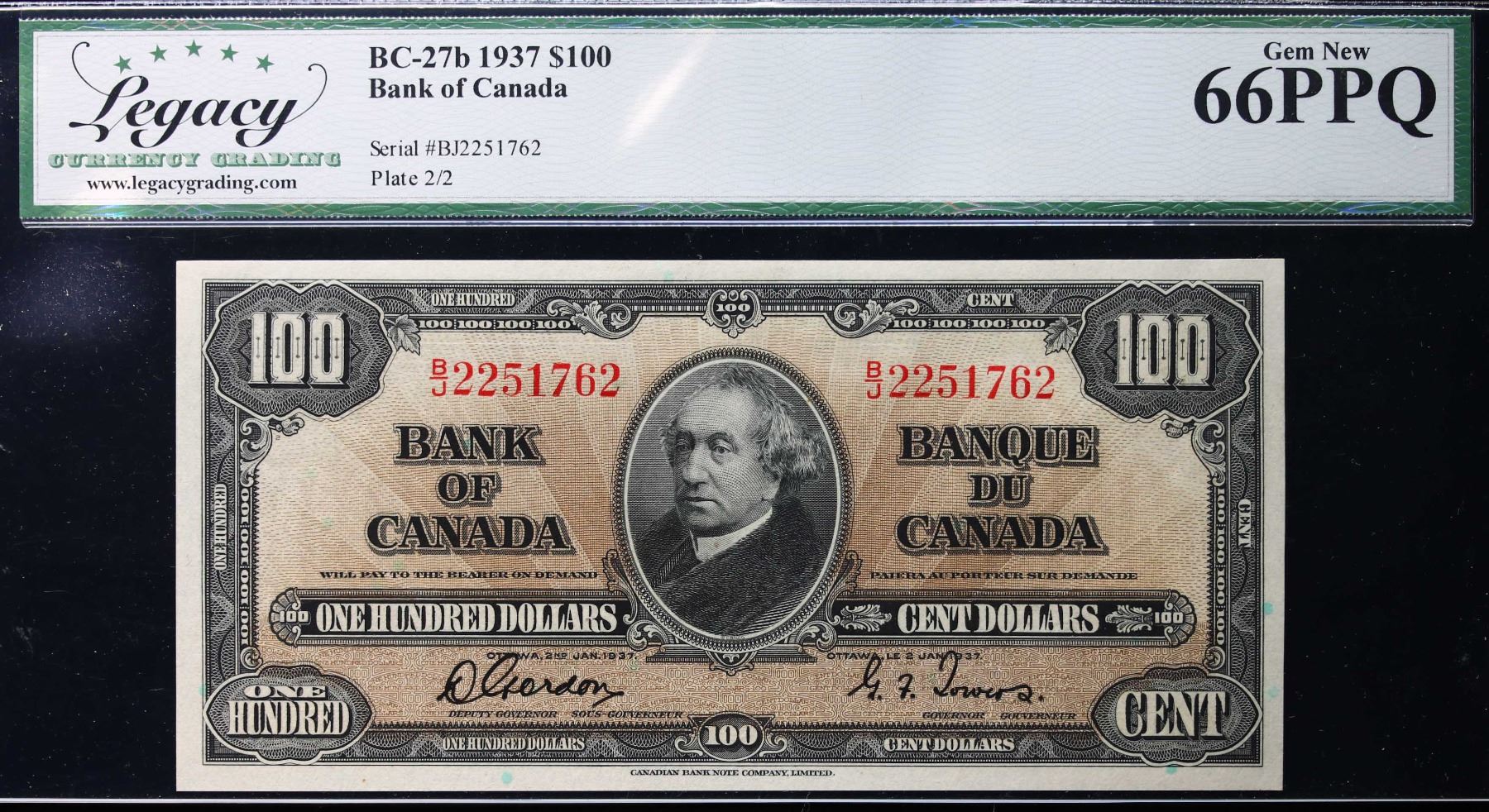 1937 $100 BC-27b #B/J2251762 LCG Superb Gem Uncirculated-66PPQ. This is a pristine issue with great eye appeal, good margins and superb embossing.