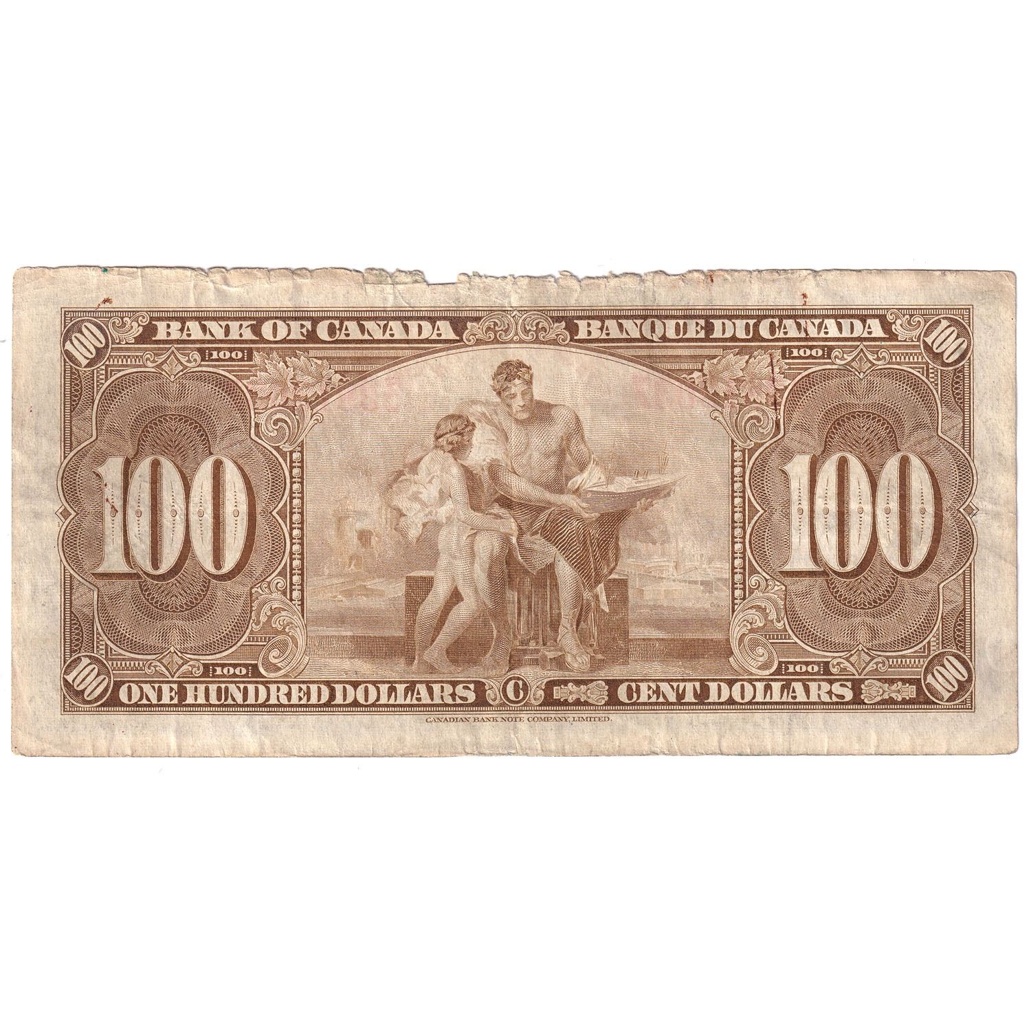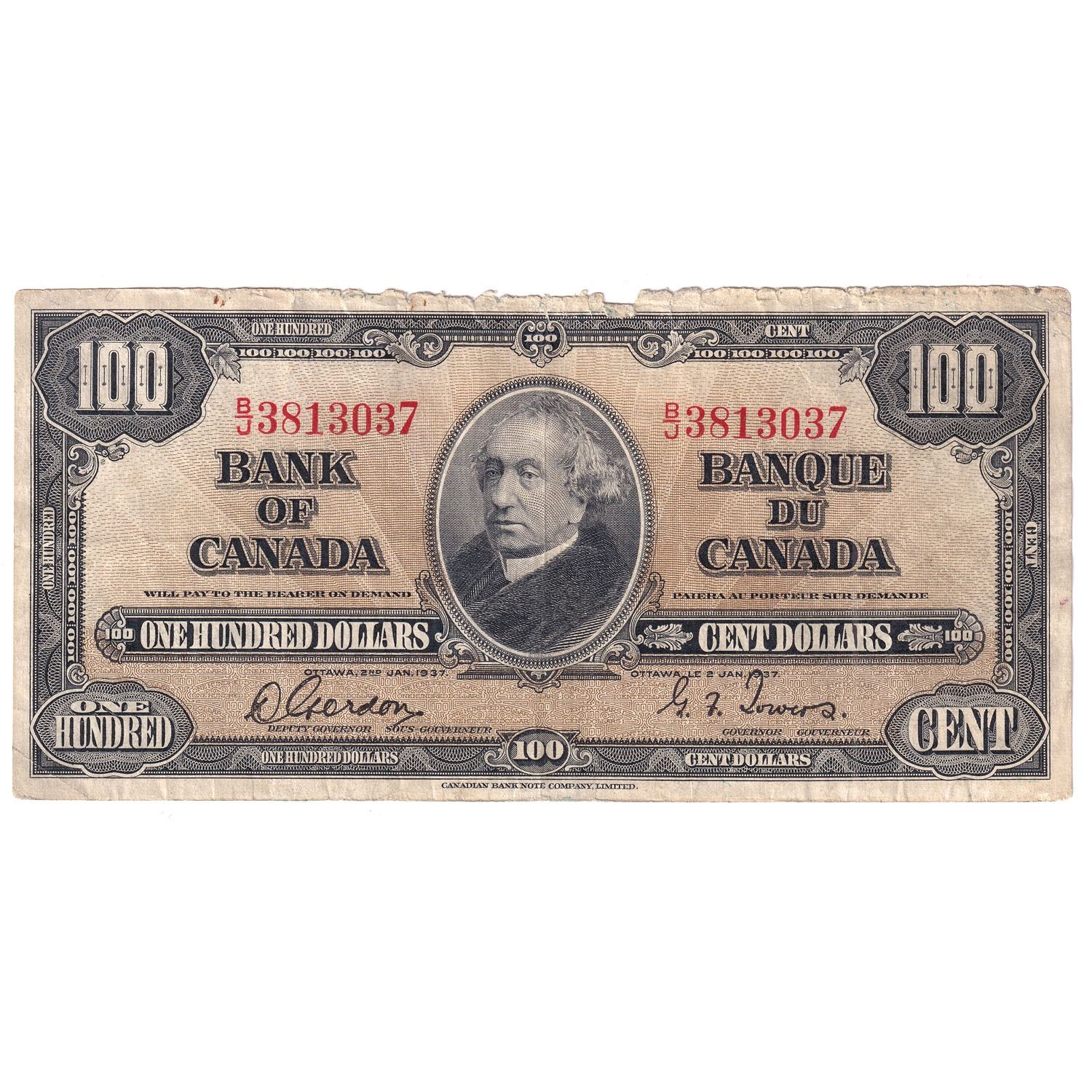 1937 $100 BC-27b, Bank of Canada, Gordon-Towers, B/J3813037, VF. Note is frayed at the top.