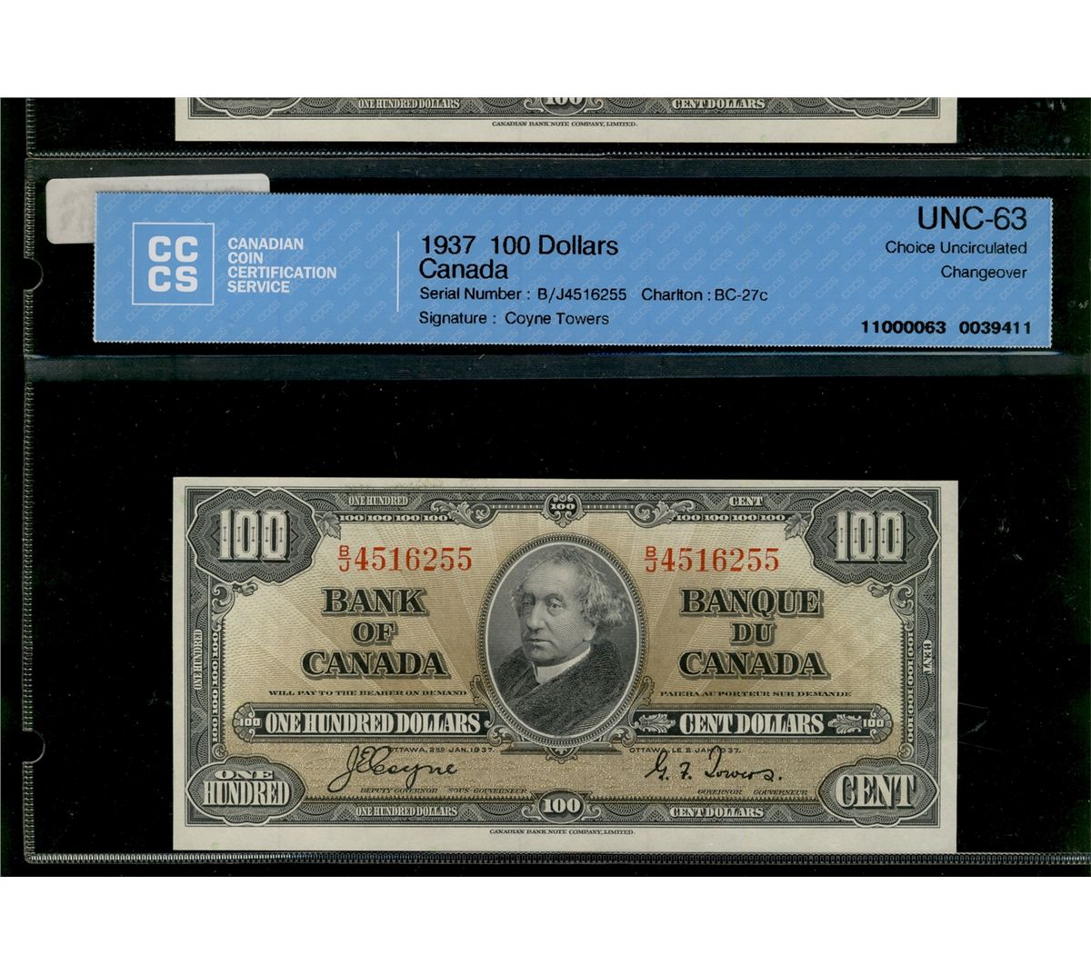 1937 $100 BC-27c #BJ4516255, CCCS UNC63. Designated as Changeover.