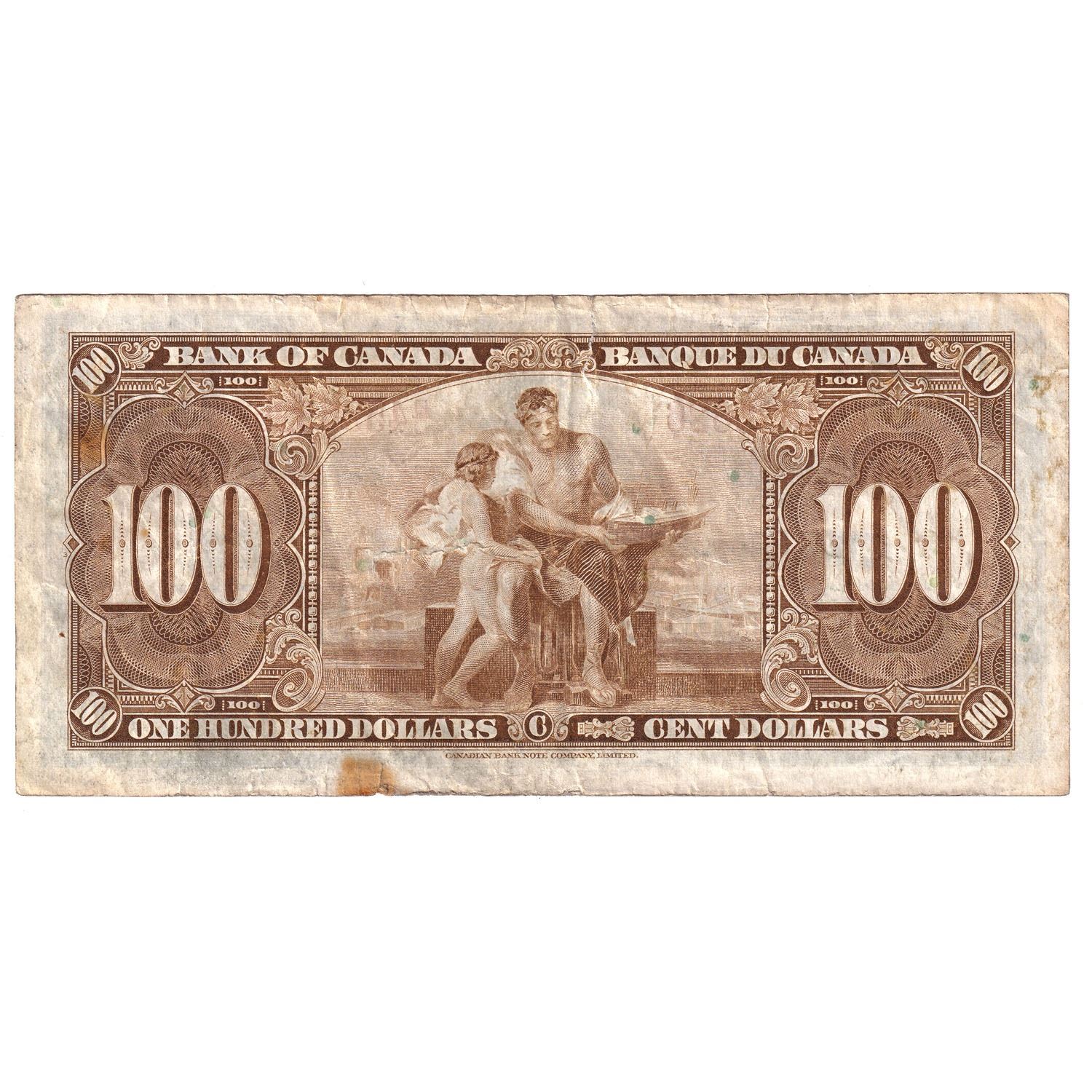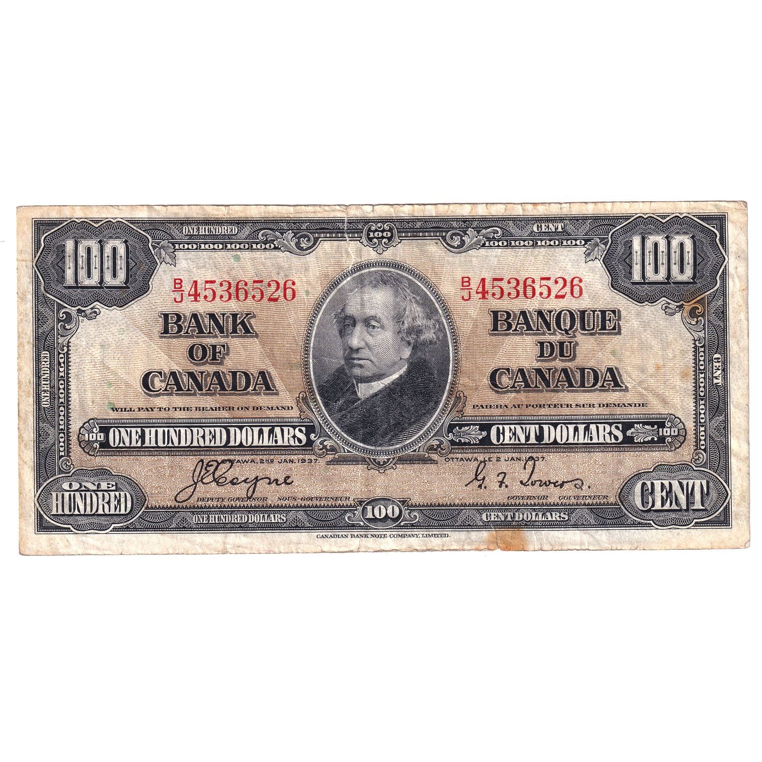 1937 $100 BC-27c Bank of Canada, Coyne-Towers, B/J4536526, VF. Note has some tears and stains.