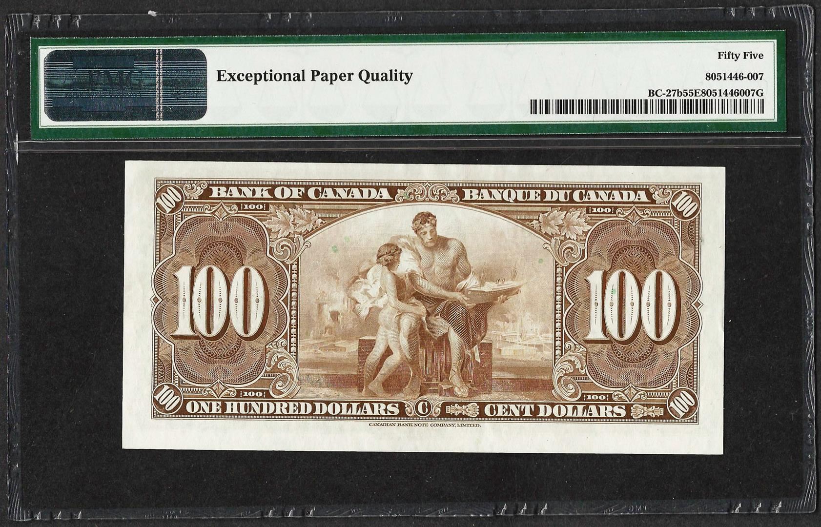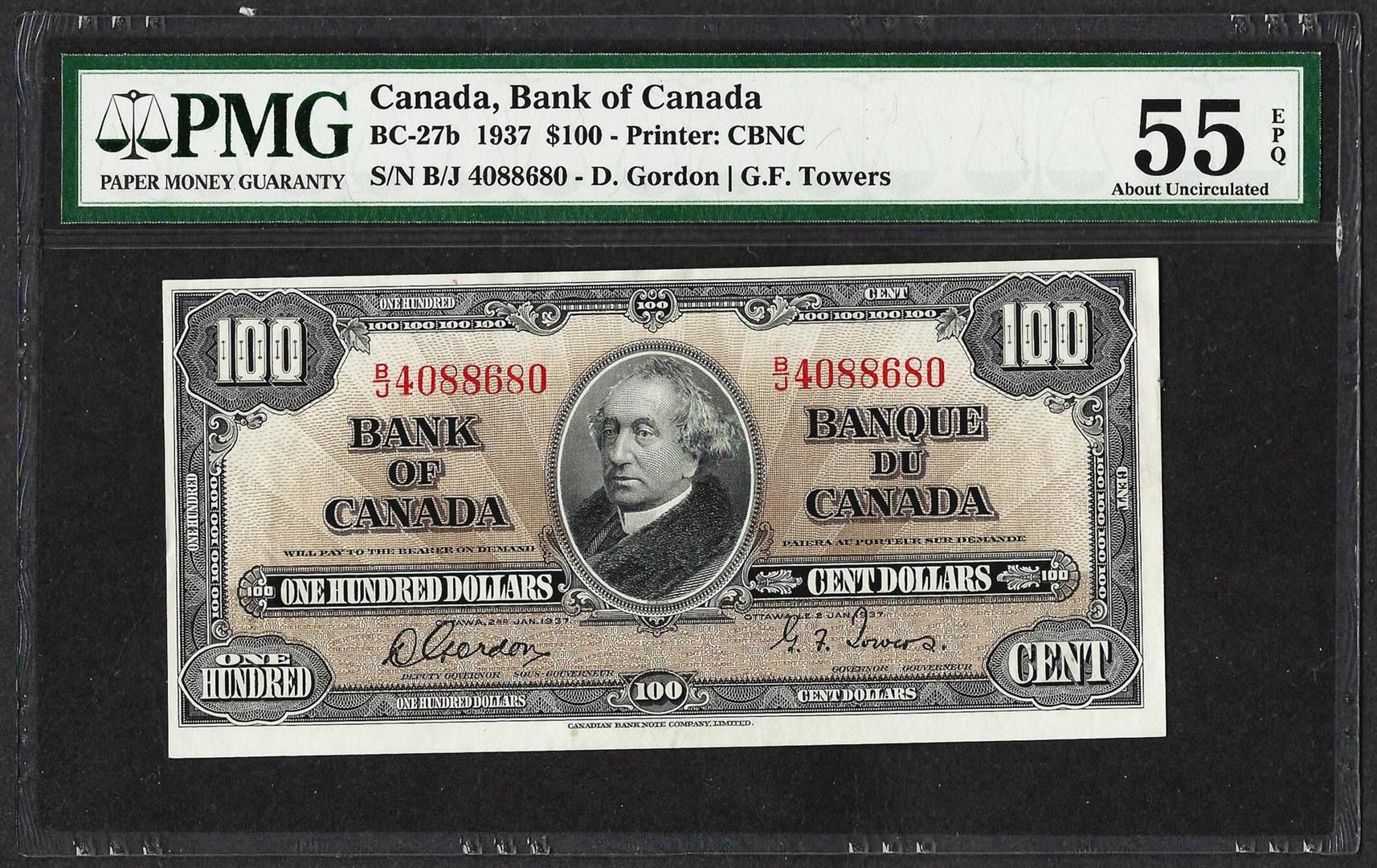 One 1937 $100 Bank of Canada Note BC-27b PMG About Uncirculated 55EPQ. PMG Certified.
