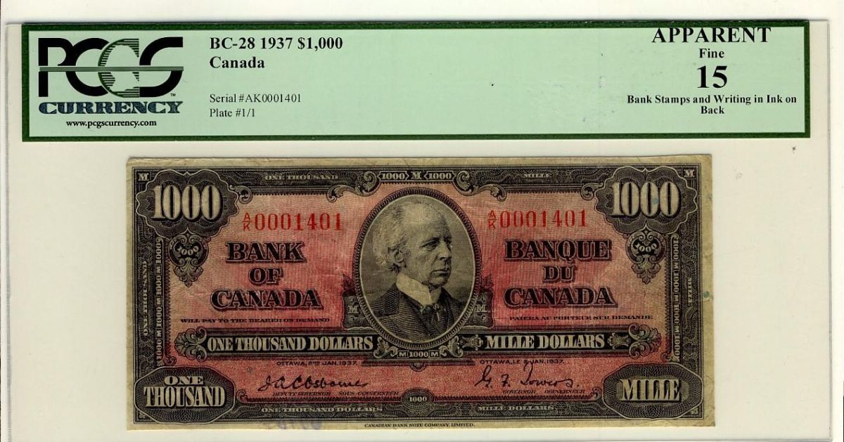 1937 $1000 BC-28 A/K0001401 PCGS APP F15 Bank Stamps and Writing in Ink on Back. An affordable example.