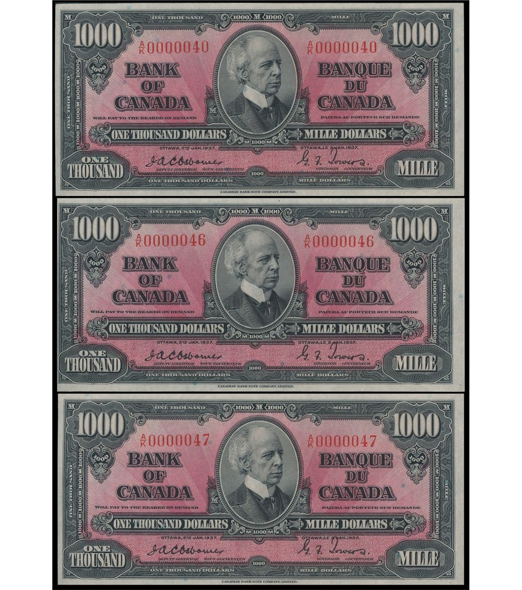 1937 $1000 BC-28 #AK0000040, 0000046 & 0000047. Lot of 3 Choice issue Low Serial and two consecutive notes. All PMG CH UNC63.