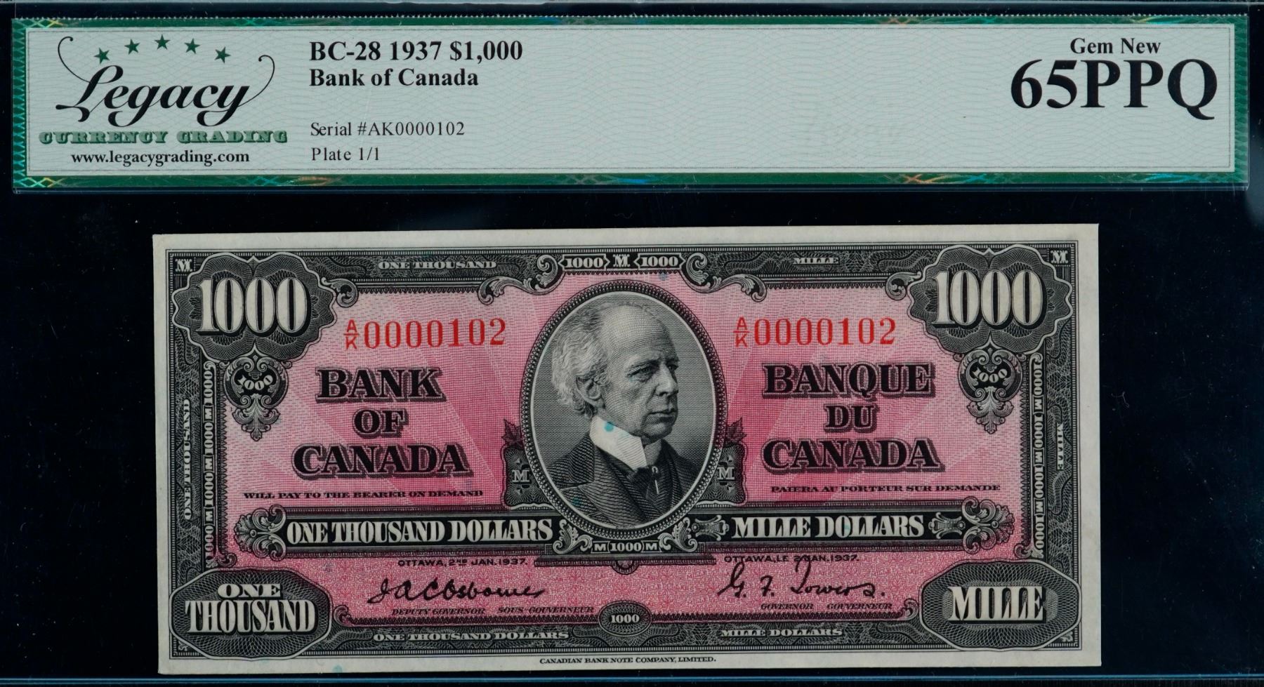 1937 $1000 BC-28 #AK0000102, LCG Gem Uncirculated-65PPQ. Sublime example with great embossing and centering. The note is ultra bright and so attractive. You will like this example.
