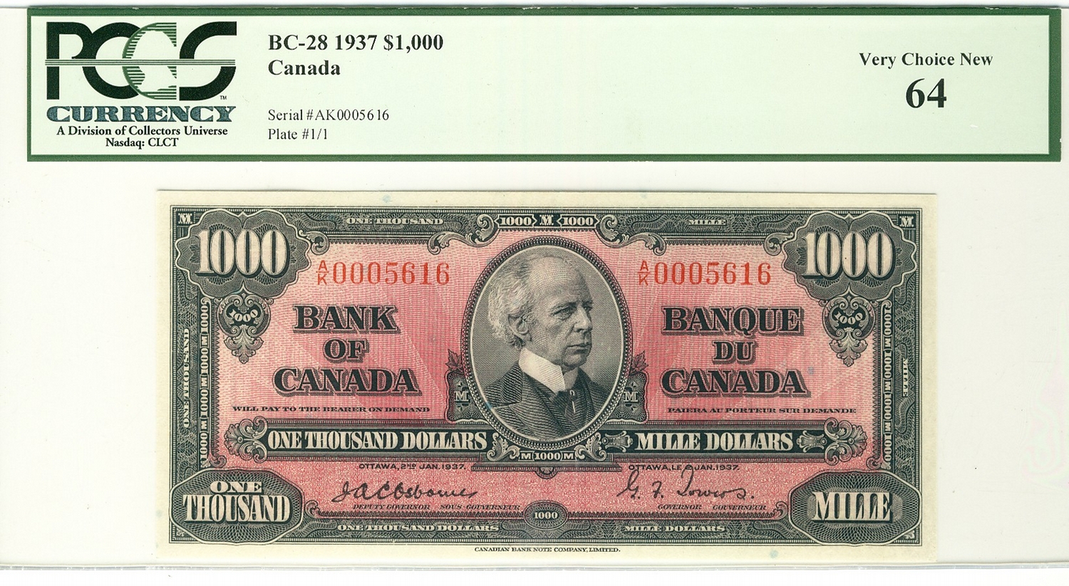 1937 $1000 BC-28 PCGS Choice UNC64. Superb example with great colours and centering.