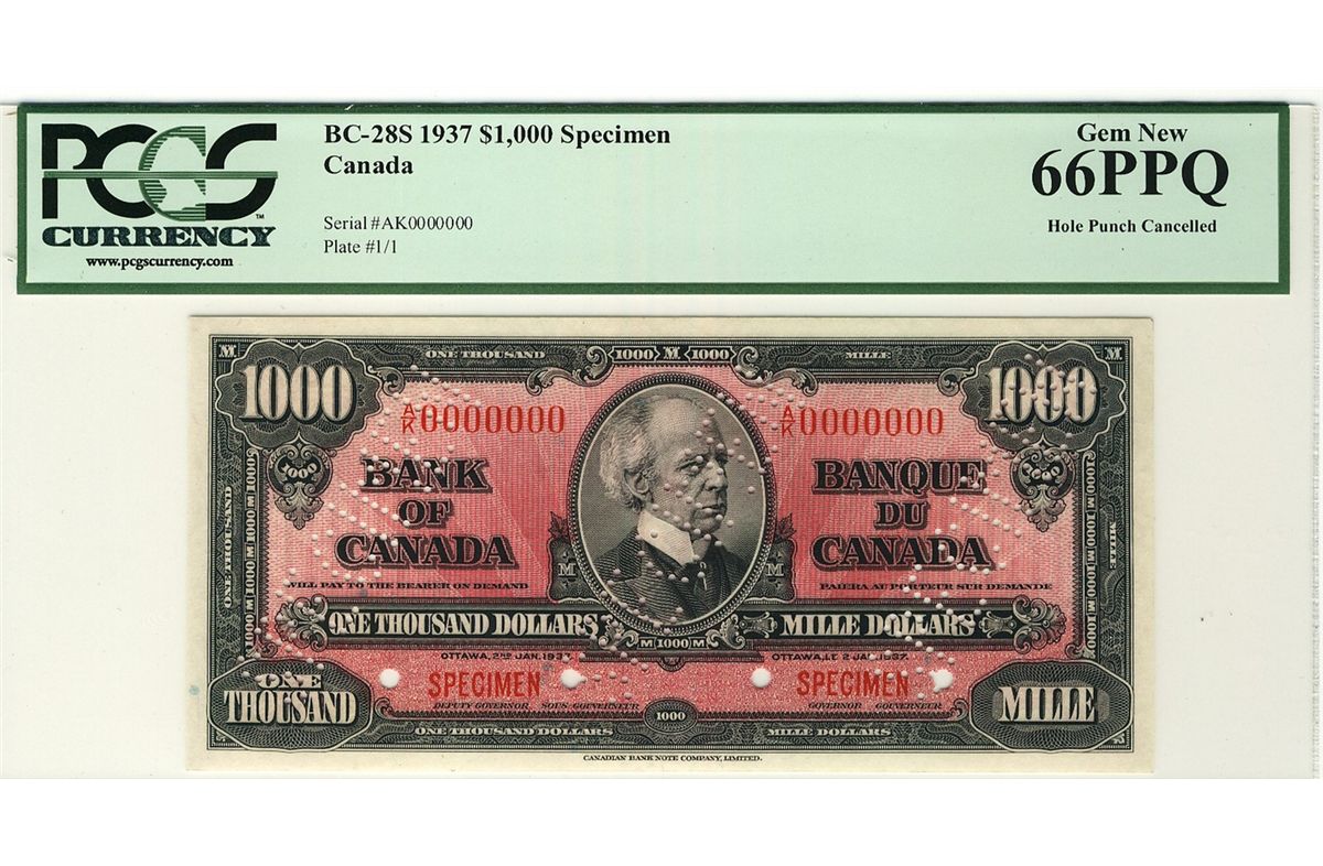 1937 $1000 BC-28S. PCGS UNC66PPQ. Great example with great margins. Vibrant colours. So attractive.