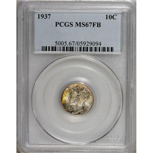<B>1937 10C MS67 Full Bands PCGS.</B></I> PCGS Population (612/33). NGC Census: (457/15). Mintage: 56,865,756. Numismedia Wsl. Price for NGC/PCGS coin in MS67: $180. (#5005)<BR><BR><B>Coin Engraver:</B> Adolph A. Weinman<BR><BR><b>Shipping:</b> Coins & Currency (<a target="_blank" href="http://www.heritageauctions.com/common/shipping.php">view shipping information</a>\)