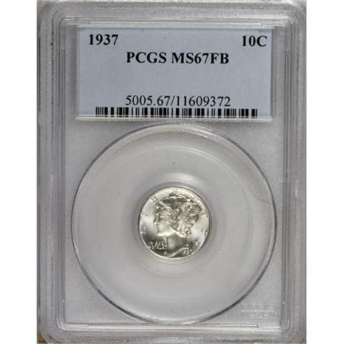 <B>1937 10C MS67 Full Bands PCGS.</B></I> PCGS Population (614/33). NGC Census: (457/15). Mintage: 56,865,756. Numismedia Wsl. Price for NGC/PCGS coin in MS67: $175. (#5005)<BR><BR><B>Coin Engraver:</B> Adolph A. Weinman<BR><BR><b>Shipping:</b> Coins & Currency (<a target="_blank" href="http://www.heritageauctions.com/common/shipping.php">view shipping information</a>)