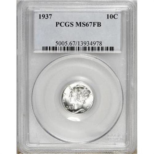 <B>1937 10C MS67 Full Bands PCGS.</B></I> PCGS Population (621/33). NGC Census: (456/15). Mintage: 56,865,756. Numismedia Wsl. Price for NGC/PCGS coin in MS67: $175. (#5005)<BR><BR><B>Coin Engraver:</B> Adolph A. Weinman<BR><BR><b>Shipping:</b> Coins & Currency (<a target="_blank" href="http://www.heritageauctions.com/common/shipping.php">view shipping information</a>)