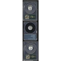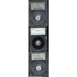 <B>1937<10C> MS65 Full Bands PCGS,</B></I> well struck, untoned, and satiny, with light color and no observable marks; <B>1937-D MS65 Full Bands PCGS,</B></I> fully struck and lustrous, with unmarked surfaces that display lovely mottled charcoal, olive, and russet patina; and a <B>1937-S MS66 Full Bands PCGS,</B></I> sharply detailed with a bright, brilliant appearance, a tiny luster graze in the right reverse field, and a trace of die polish (as struck) around the obverse portrait.<BR><I>From The Reed Hawn Collection of Mercury Dimes.</B></I> 3 coins <BR><BR><B>Important notice:</B> Heritage usually auctions material at the rate of 200-250 lots per hour. On some occasions eBay Live bid software or the Internet may not be able to keep up with the pace of the auction. We recommend placing a realistic absentee bid now as insurance to avoid disappointment. Occasionally the auctioneer may eliminate or reject an eBay Live bid, and the auctioneer may also reopen a lot after the close of the eBay live bidding (usually because we missed an audience bid), and may reject your bid even if it shows you as the winning bidder. By bidding via eBay Live, you agree that Heritage may award the lot to another bidder at its sole discretion under the circumstances described above or any other reasonable circumstances. Since eBay bids are not shown to us until we open the lot on the floor, we treat those bids just like floor bids. In most cases the floor responds before the eBay bid is presented to us, due to Internet lag time, so for consistency we have made it a policy that floor bids are always considered first over tie eBay live bids. Also please note that all Heritage lots purchased through eBay Live carry a 20% Buyer's Premium. Please make sure you read the Terms and Conditions before you bid. </span></font></tr></table></td></tr></table>