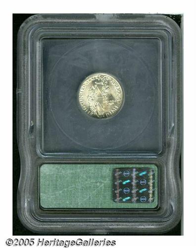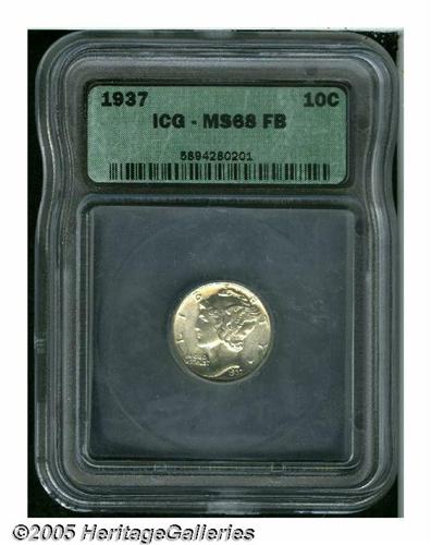 <B>1937<10C> MS68 Full Bands ICG.</B></I> Just the slightest hints of light tan color are noted on this otherwise brilliant Mercury dime that exhibits fully-lustrous, mark-free surfaces. Despite the "Full Bands" designation on the ICG holder, the middle bands, while almost completely split, are not fully rounded. The prospective bidder should personally inspect this coin.