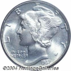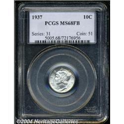 <B>1937<10C> MS68 Full Bands PCGS.</B></I> Even for an issue that is known for high quality survivors, this is an extraordinarily well preserved example. Dazzling, untoned surfaces are strongly detailed and look essentially as they did when struck. A die clash mark (as struck), in the right reverse field, reflects the rear border of Liberty's cap. Population: 15 in 68, 0 finer (7/04). <BR><BR><B>Important notice:</B> Heritage usually auctions material at the rate of 200-250 lots per hour. On some occasions eBay Live bid software or the Internet may not be able to keep up with the pace of the auction. We recommend placing a realistic absentee bid now as insurance to avoid disappointment. Occasionally the auctioneer may eliminate or reject an eBay Live bid, and the auctioneer may also reopen a lot after the close of the eBay live bidding (usually because we missed an audience bid), and may reject your bid even if it shows you as the winning bidder. By bidding via eBay Live, you agree that Heritage may award the lot to another bidder at its sole discretion under the circumstances described above or any other reasonable circumstances. Since eBay bids are not shown to us until we open the lot on the floor, we treat those bids just like floor bids. In most cases the floor responds before the eBay bid is presented to us, due to Internet lag time, so for consistency we have made it a policy that floor bids are always considered first over tie eBay live bids. Also please note that all Heritage lots purchased through eBay Live carry a 20% Buyer's Premium. Please make sure you read the Terms and Conditions before you bid. </span></font></tr></table></td></tr></table>