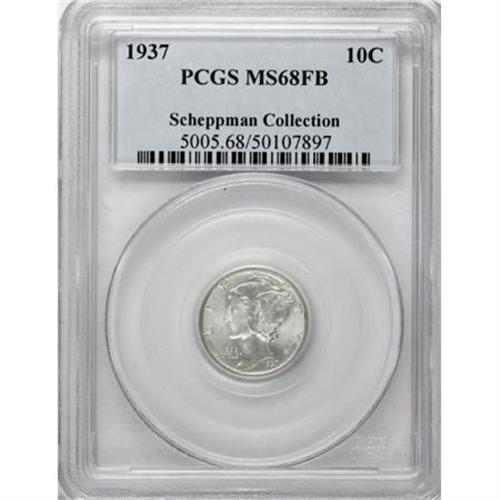 <B>1937 10C MS68 Full Bands PCGS.</B></I> A spectacular survivor, tied for numerically finest Full Bands survivor at NGC and PCGS (12/07). Delicate rose, cream, and silver-white tints enliven the magnificently preserved and slightly satiny surfaces of this sharply struck example.<BR><I>From The Scheppman Collection, #4 PCGS Registry of Full Band Mercury Dimes.</B></I><BR><BR><B>Coin Engraver:</B> Adolph A. Weinman<BR><BR><b>Shipping:</b> Coins & Currency (<a target="_blank" href="http://www.heritageauctions.com/common/shipping.php">view shipping information</a>)