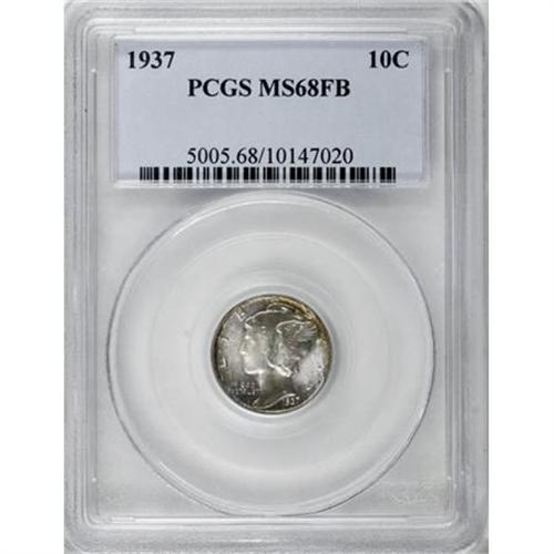<B>1937 10C MS68 Full Bands PCGS.</B></I> Pale blue, violet, and orange patina drapes this highly lustrous and boldly struck piece. Immaculately preserved throughout. Population: 33 in 68, 0 finer (3/08).<BR><BR><B>Coin Engraver:</B> Adolph A. Weinman<BR><BR><b>Shipping:</b> Coins & Currency (<a target="_blank" href="http://www.heritageauctions.com/common/shipping.php">view shipping information</a>)