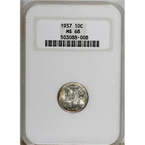 <B>1937 10C MS68 NGC.</B></I> NGC Census: (14/0). PCGS Population (6/0). Mintage: 56,865,756. Numismedia Wsl. Price for NGC/PCGS coin in MS68: $292. (#5004)<BR><BR><B>Coin Engraver:</B> Adolph A. Weinman<BR><BR><b>Shipping:</b> Coins & Currency (<a target="_blank" href="http://www.heritageauctions.com/common/shipping.php">view shipping information</a>)