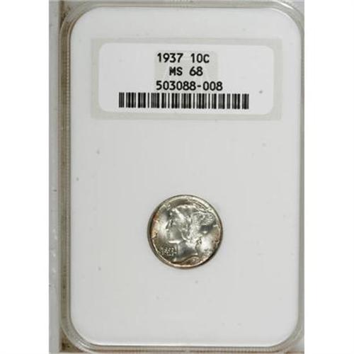 <B>1937 10C MS68 NGC.</B></I> NGC Census: (14/0). PCGS Population (6/0). Mintage: 56,865,756. Numismedia Wsl. Price for NGC/PCGS coin in MS68: $292. (#5004)<BR><BR><B>Coin Engraver:</B> Adolph A. Weinman<BR><BR><b>Shipping:</b> Coins & Currency (<a target="_blank" href="http://www.heritageauctions.com/common/shipping.php">view shipping information</a>)
