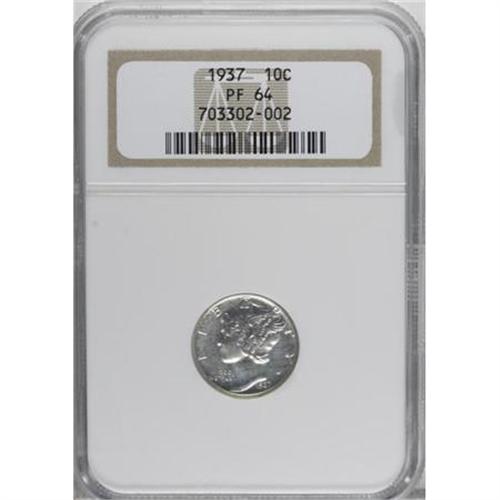 <B>1937 10C PR64 NGC.</B></I> NGC Census: (184/791). PCGS Population (393/1188). Mintage: 5,756. Numismedia Wsl. Price for NGC/PCGS coin in PR64: $500. (#5072)<BR><BR><B>Coin Engraver:</B> Adolph A. Weinman<BR><BR><b>Shipping:</b> Coins & Currency (<a target="_blank" href="http://www.heritageauctions.com/common/shipping.php">view shipping information</a>)