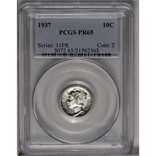 <B>1937<10C> PR65 PCGS.</B></I> A very bright Gem proof with a glassy, untoned appearance and immaculately preserved surfaces. The proof mintage of 5,756 was a tiny fraction of the nearly 57 million business strikes.