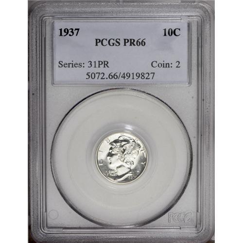 <B>1937<10C> PR66 PCGS.</B></I> This pretty specimen exhibits razor-sharp striking details and untoned surfaces that reveal unusually profound reflectivity in the fields, especially on the reverse. A virtually perfect proof Mercury dime.