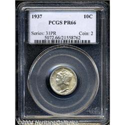 <B>1937<10C> PR66 PCGS.</B></I> The design elements exhibit razor sharp detail on this bright specimen. Speckled milky-gray color hugs both sides, becoming slightly streaked on the obverse. <BR><BR><B>Important notice:</B> Heritage usually auctions material at the rate of 200-250 lots per hour. On some occasions eBay Live bid software or the Internet may not be able to keep up with the pace of the auction. We recommend placing a realistic absentee bid now as insurance to avoid disappointment. Occasionally the auctioneer may eliminate or reject an eBay Live bid, and the auctioneer may also reopen a lot after the close of the eBay live bidding (usually because we missed an audience bid), and may reject your bid even if it shows you as the winning bidder. By bidding via eBay Live, you agree that Heritage may award the lot to another bidder at its sole discretion under the circumstances described above or any other reasonable circumstances. Since eBay bids are not shown to us until we open the lot on the floor, we treat those bids just like floor bids. In most cases the floor responds before the eBay bid is presented to us, due to Internet lag time, so for consistency we have made it a policy that floor bids are always considered first over tie eBay live bids. Also please note that all Heritage lots purchased through eBay Live carry a 20% Buyer's Premium. Please make sure you read the Terms and Conditions before you bid.