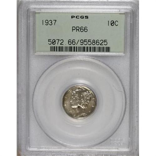 <B>1937 10C PR66 PCGS.</B></I> This intricately struck and low mintage Premium Gem has light milk-gray toning with a few russet freckles on the rims and Liberty's neck. Encapsulated in an old green label holder.<BR><BR><b>Shipping:</b> Coins & Currency (<a target="_blank" href="http://www.heritageauctions.com/common/shipping.php">view shipping information</a>)