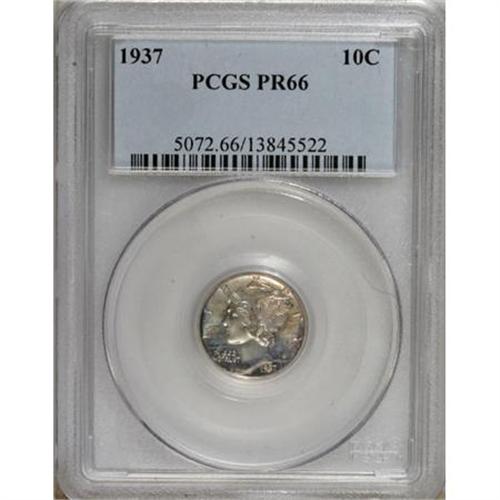 <B>1937 10C PR66 PCGS.</B></I> PCGS Population (469/203). NGC Census: (349/171). Mintage: 5,756. Numismedia Wsl. Price for NGC/PCGS coin in PR66: $725. (#5072)<BR><BR><B>Coin Engraver:</B> Adolph A. Weinman<BR><BR><b>Shipping:</b> Coins & Currency (<a target="_blank" href="http://www.heritageauctions.com/common/shipping.php">view shipping information</a>\)