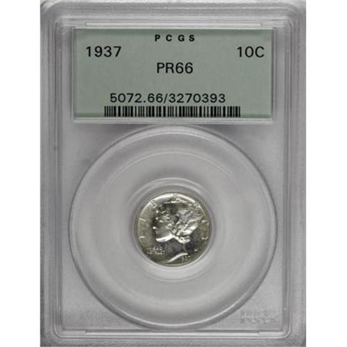 <B>1937 10C PR66 PCGS.</B></I> This penetratingly struck and essentially immaculate second-year proof has original cream-gray toning throughout the fields. Encased in a green label holder.<BR><BR><B>Coin Engraver:</B> Adolph A. Weinman<BR><BR><b>Shipping:</b> Coins & Currency (<a target="_blank" href="http://www.heritageauctions.com/common/shipping.php">view shipping information</a>)